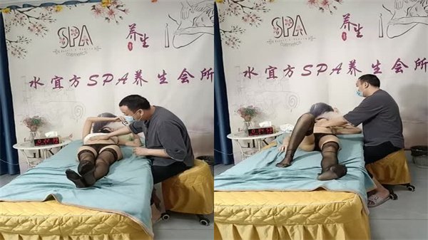 水宜方SPA按摩养生会所里的黑丝小少妇让大哥在床上按摩撩骚揉奶玩逼